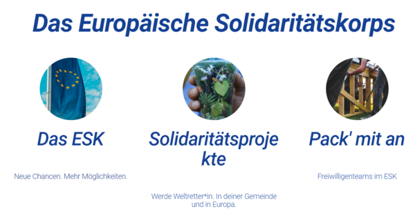 Jugendliche (18 bis 30 Jahre) können sich in gemeinnützigen Projekten im eigenen Land oder im Ausland engagieren. Auch Jobs und Praktika in ganz Europa werden über das Europäische Solidaritätskorps vermittelt.