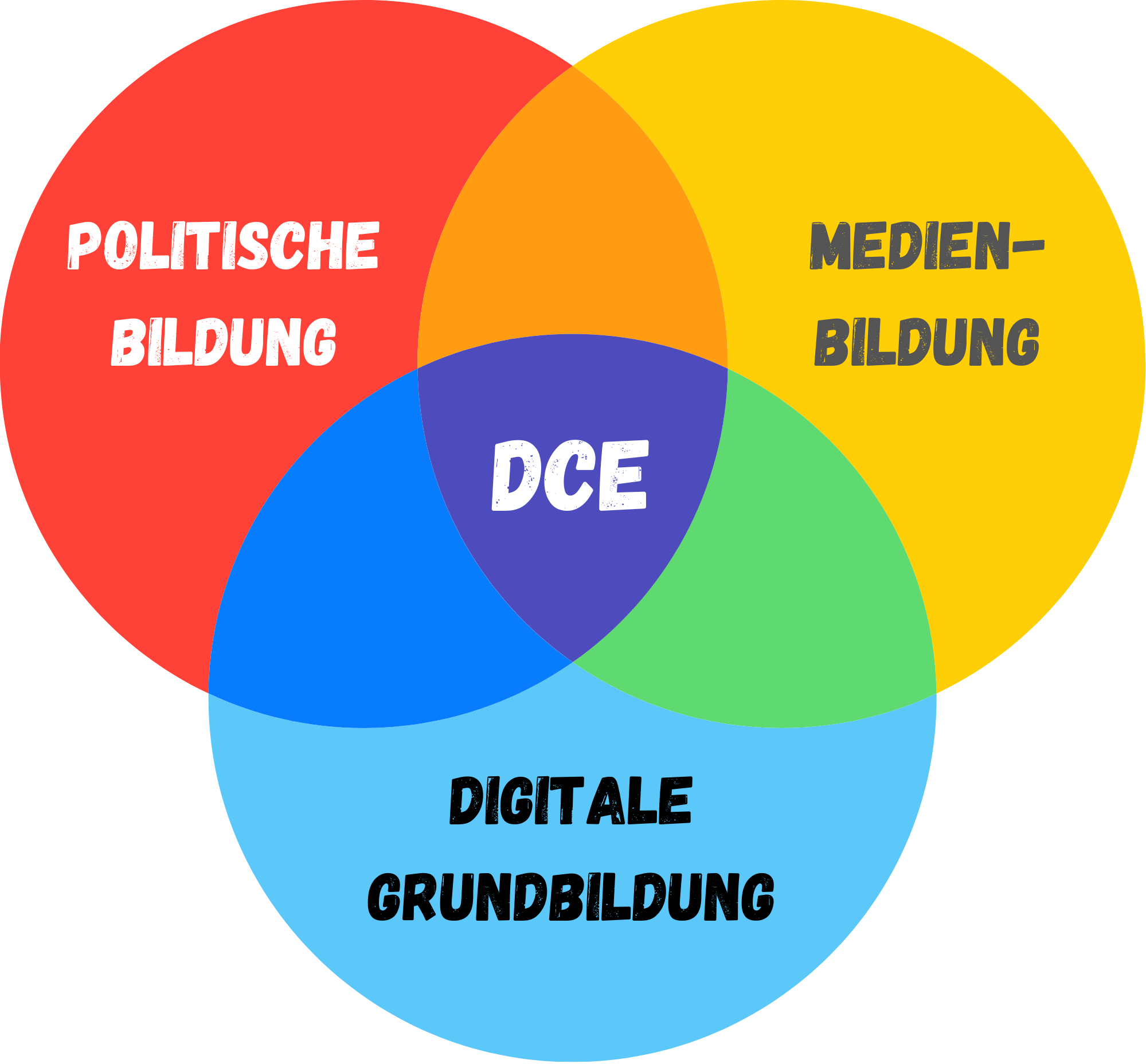 Digital Citizenship Education (DCE) ist eine Schnittmenge aus der Trias der Digitalen Grundbildung, der Politischen Bildung und der Medienbildung.
