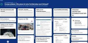 - Europa erleben: Website Bundeskanzleramt mit einer Auflistung an Möglichkeiten für eine finanzielle Unterstützung, wie etwa die Förderung bis zu 250 € Unterstützung pro Schüler:in ab der 9. Schulstufe für eine Bildungsreise zu EU-Institutionen zu erhalten.