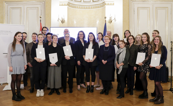 Vier Hauptpreise und sechs Anerkennungspreise wurden aus insgesamt 35 Arbeiten von einer Fachjury ausgewählt. Die Preisträgerinnen für 2019 wurden am 11. November 2019 im BMBWF in Anwesenheit von Bildungsministerin Iris Rauskala ausgezeichnet.