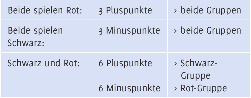 - Spielt ein Team eine schwarze Karte und ein Team eine rote Karte, dann erhält das Team, das „Schwarz“ gespielt hat, 6 Pluspunkte. Das andere Team erhält 6 Minuspunkte.