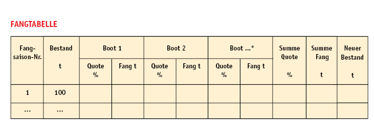 * Sollten mehr als sechs Boote im Spiel sein, muss die maximale Fangquote reduziert werden: 100/„Anzahl Boote“ = maximale Fangquote. Rest bzw. Nachkommastellen können ignoriert werden.