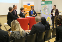 Das Podiumsgespräch wurde mit Sabine Schneeberger (Referentin für Grundsatzangelegenheiten der Mitgliedschaft Österreichs in der EU, Soziales und Gesundheit des Bundeskanzleramts), Jörg Wojahn (Leiter der Vertretung der Europäischen Kommission in Österreich), Maria Pichlbauer (Leiterin des Servicereferats EU/Internationalisierung des LSR für Steiermark) und Nicolaus Drimmel (stv. Generalsekretär des Österreichischen Gemeindebunds) geführt.