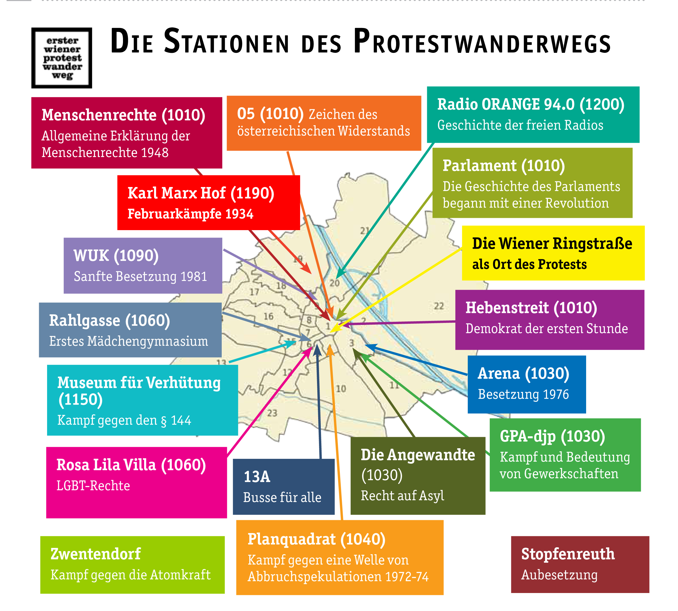 Die am 1. Mai 1865 eröffnete Ringstraße ist ein wichtiger Ort der Repräsentation und Machtdemonstration der Herrschenden. Sie ist aber auch ein Ort, den die Bürgerinnen und Bürger nützen, um ihren Forderungen Nachdruck zu verleihen. Diese Station des Protestwanderwegs widmet sich auf einem Spaziergang vom Schwarzenbergplatz bis zum Rathaus einer Auswahl von wichtigen Demonstrationen und Kundgebungen.